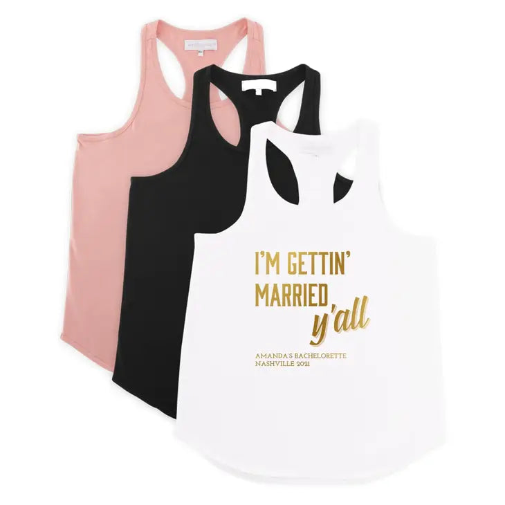 A stylish top to pair with jeans and cowgirl boots, this country themed design makes it the perfect shirt for classy country gals to party in. Bachelorette party, bridal shower, or stagette. Whatever the wedding occasion, the bride-to-be and her bridesmaids will make a fashionable crew with these cute, printed tank tops. Available in white, black, or blush pink, the cotton blend tanks can be printed with a name, nickname, wedding date, or other custom text to go with the graphic print design. The perfect shirts for a night on the town, working out, or fun in the sun. The tanks are an awesome gift idea for all your best girls.