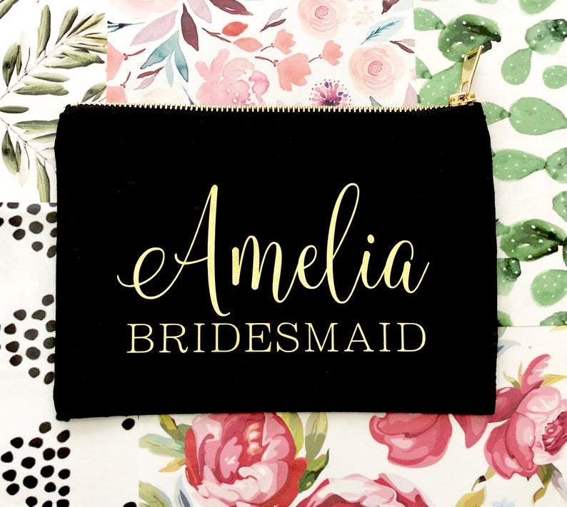 Made in 100% cotton canvas, this dainty Dopp kit may be printed with up to 10 characters of your choice of words or names, making it a perfect proposal gift, bridal shower giveaway, or “thank you” token to your girl gang.