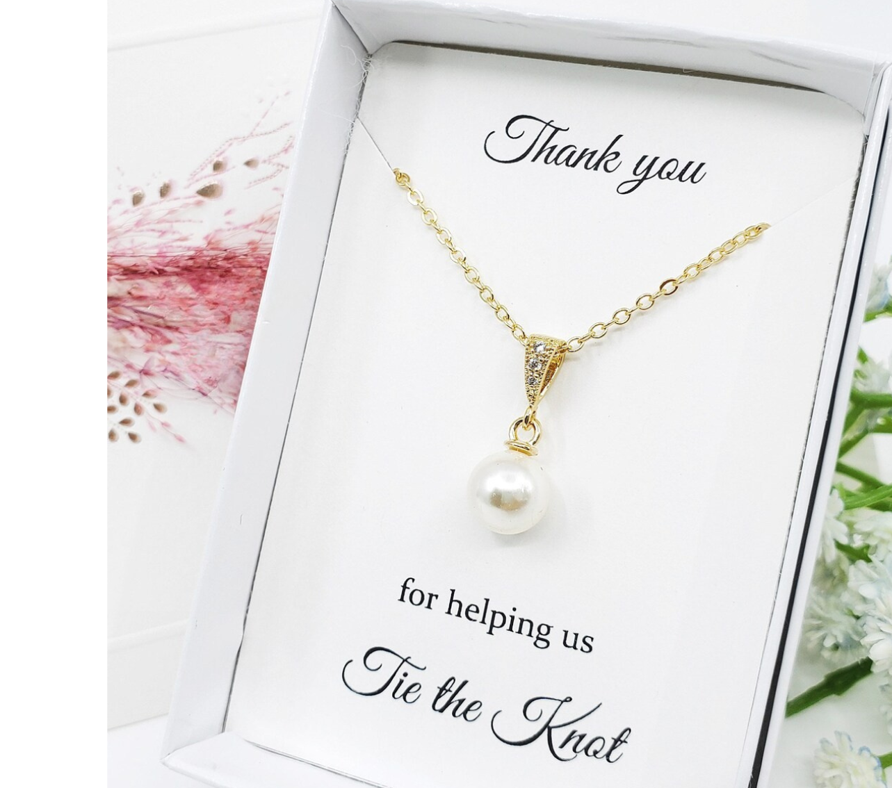 Thank the women who stand by your side on your special day with a gift as timeless as your friendship. This beautiful pearl and gold pendant necklace adds a touch of elegance and sophistication, making it the perfect accessory for the wedding day and beyond. Each necklace comes displayed on your choice of 10 different jewelry card sayings, allowing you to create a meaningful and memorable gift for your bridesmaids, maid of honor, mother of the bride, or mother of the groom.