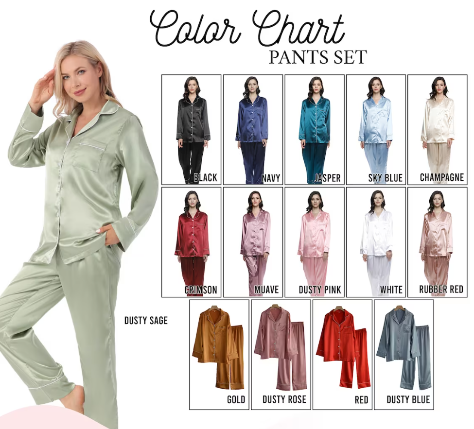 Give her the gift of sleep with these ultra-luxurious satin pajama sets with trim piping. These satin PJs are made from ultra-soft material, and each PJ set comes with a buttoned slong sleeved shirt, and pant with an elastic waist. These are the softest and most comfortable satin pajamas she'll ever wear! Perfect for your bridesmaids and bachelorette party!
