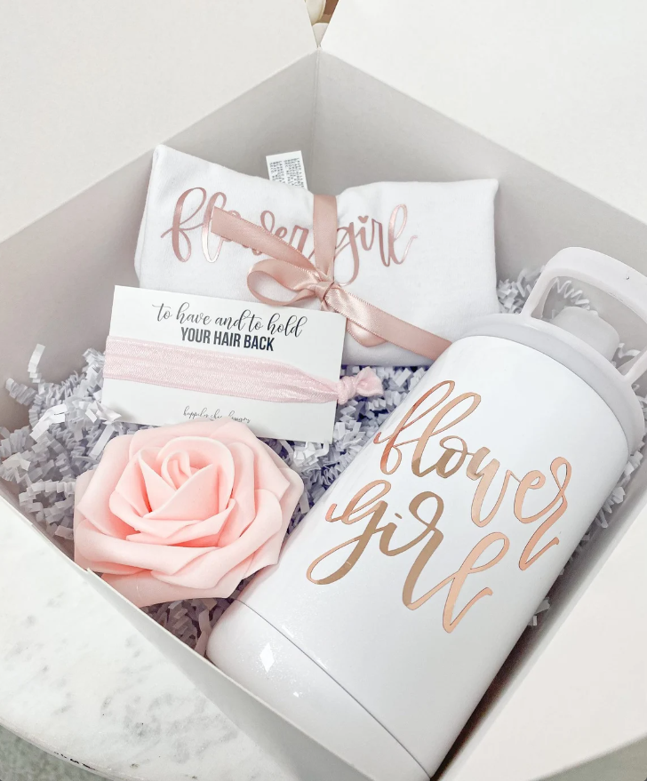 Ask your gals in style and walk away in stride. This Will You Be My Bridesmaid gift set includes must-haves in its box. Treats are as follows: proposal card with envelope (to say your piece), white and pink artificial roses, set of two light pink and tan hair ties. It's personalized, double-walled, insulated 12 oz wine tumbler with straw complete with a champagne bottle label.