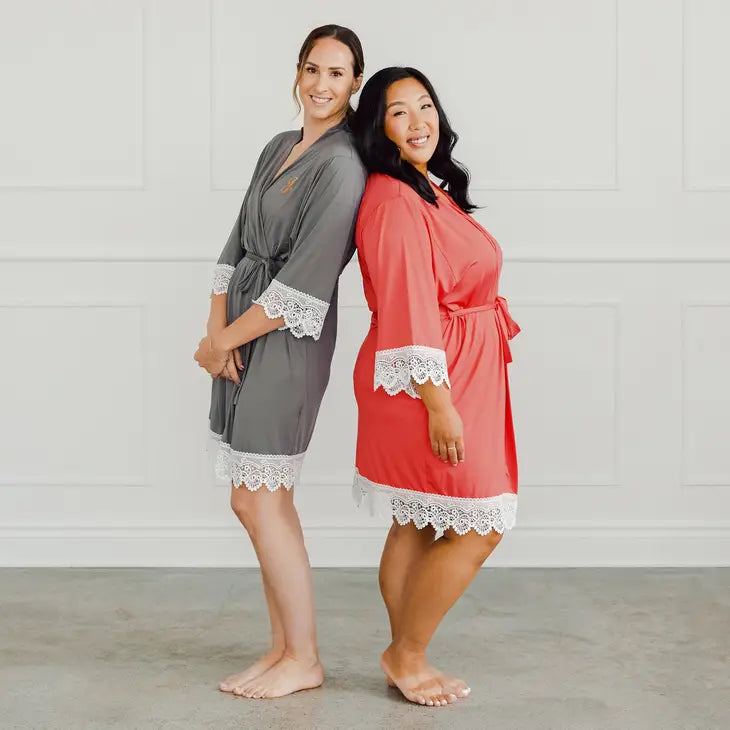 Wrap yourself and your best bridesmaids in a soft personalized jersey knit robe with white lace trim, perfect for wedding day festivities. Designed with a relaxed fit and an easy tie sash belt, you'll be stylish while getting ready in this custom dressing gown. Add an embroidered monogrammed initial to make each lightweight kimono extra special for the women in your bridal party. Made from luxury, stretch knit jersey polyester, and available in many pretty colors such as white, you will be sure to find the perfect shade for your bride tribe.