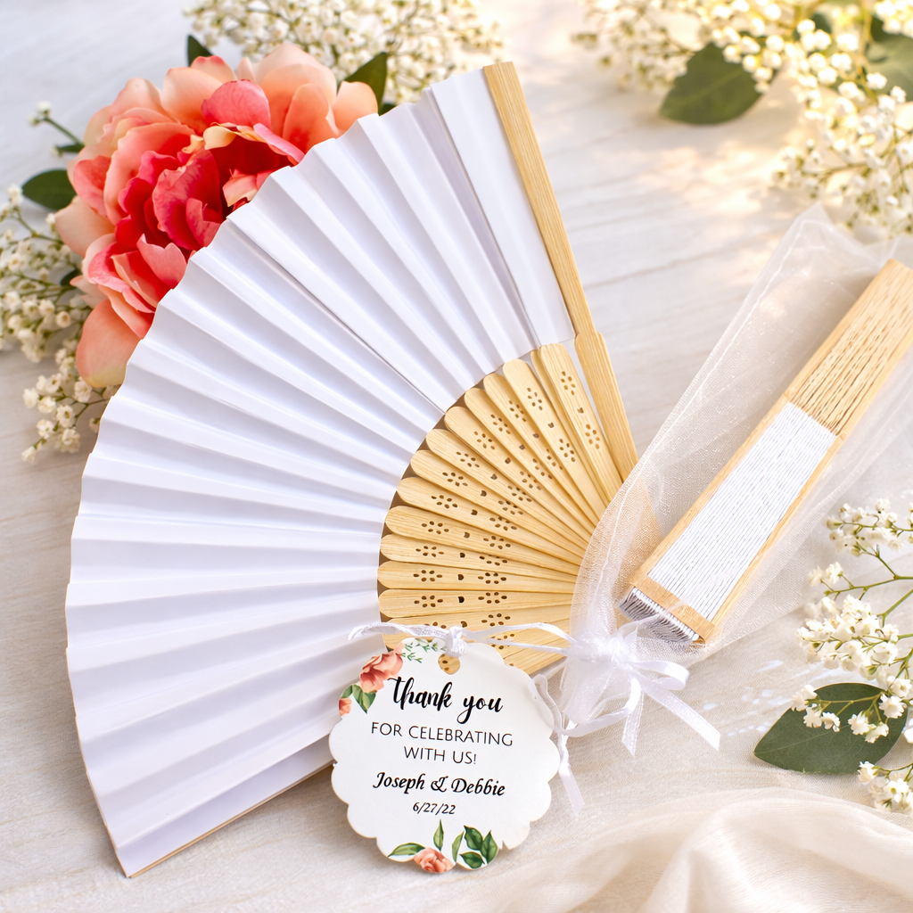 We've all been to a wedding where you needed a fan but didn't have one. These elegant hand fans are the perfect solution! With simple tags that can be personalized with your name and wedding date, your guests will be so thankful for these favors.