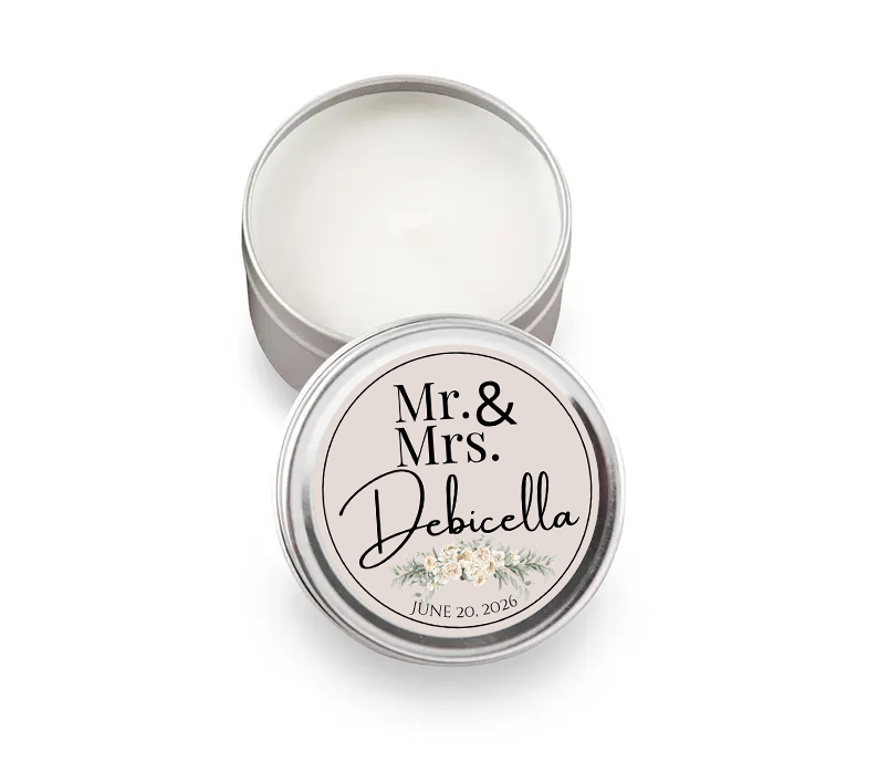 Delight your guests with these elegant custom travel-size candle favors (2oz), complete with a sculpted silver lid for a touch of sophistication. Ideal for weddings, bridal showers, destination celebrations, or as part of a wedding welcome bag, these mini candles are both beautiful and practical. Their compact tin design fits easily into purses or travel kits, making them perfect travel gifts or party favors for guests.
