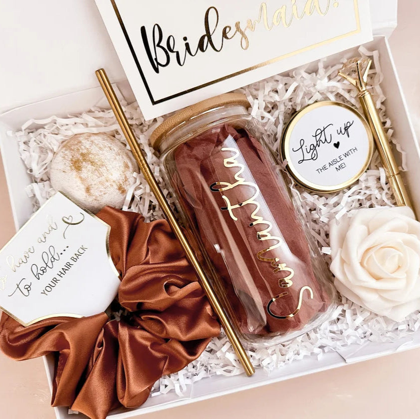 This bridesmaid proposal is the perfect gift box for your Bridesmaid/MOH. It has all the items your bridesmaids will be able to use for a relaxing day of spa, at your bachelorette, and on the day of your wedding!!!