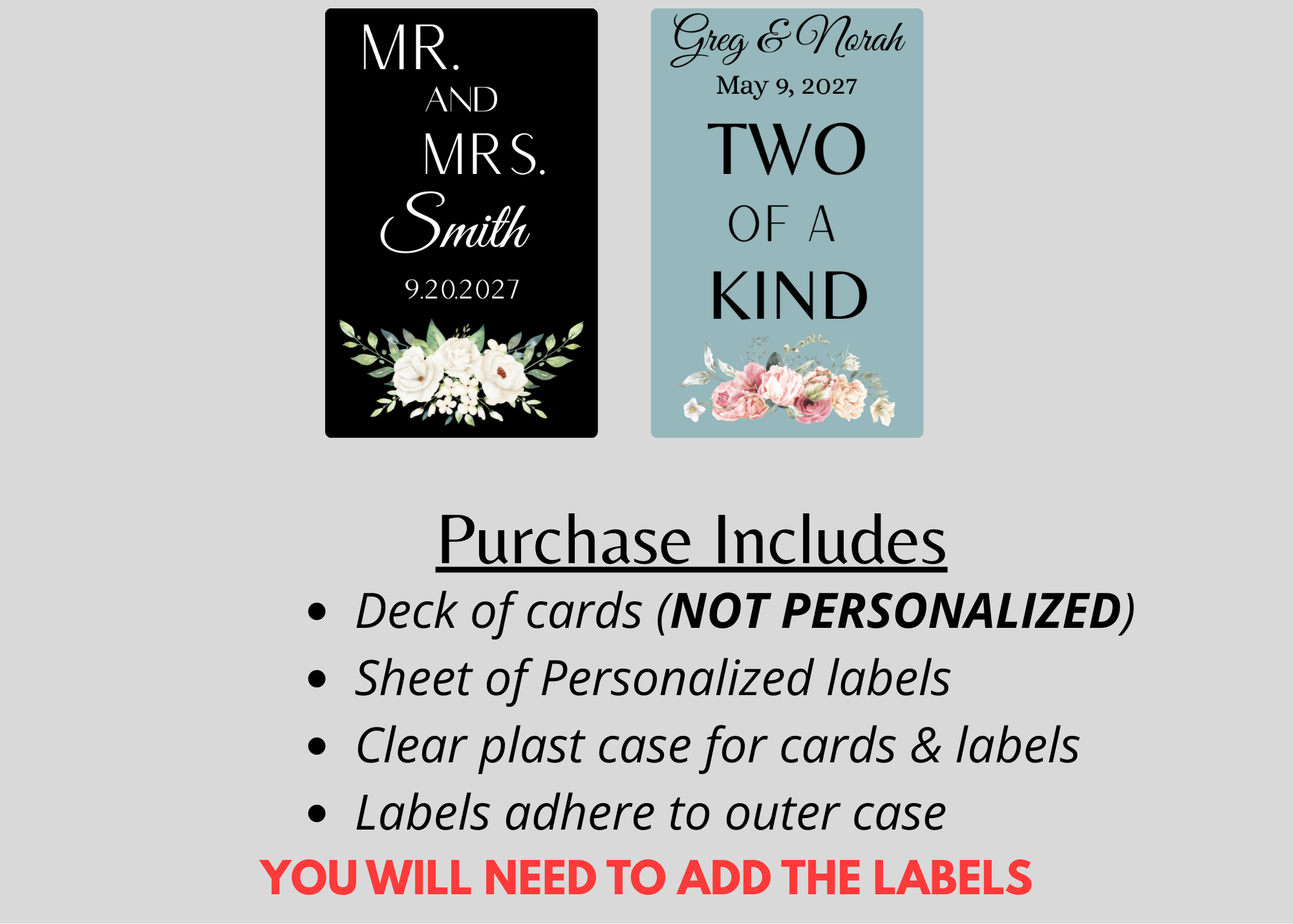 This product listing is for personalization and design for a label that will go on the outside of each plastic playing card CASE only. The playing cards themselves will NOT be personalized. You will receive a sheet with the labels that you must place on each individual case.