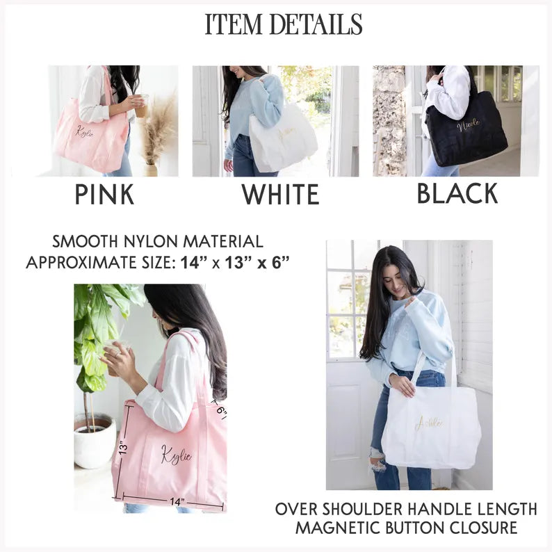 Each tote measures approximately 14” x 13” with sturdy handles designed for comfort and easy carrying. The spacious interior fits everything from makeup and phone chargers to snacks and wedding day memorabilia. Made to last, the high-quality nylon fabric resists stains and is easy to clean, ensuring your personalized bridesmaid tote stays looking fresh throughout countless uses. Customize with names to make a one-of-a-kind accessory your friends will love showing off.