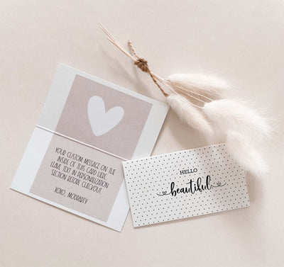 Mrs gift box sets make the perfect gift for the bride to be at the bridal shower. Each complete set includes all the items listed below packaged together with white shred in a round white gift box in a pretty floral design. A mini “hello beautiful” card (printed with your custom message inside!) is included.